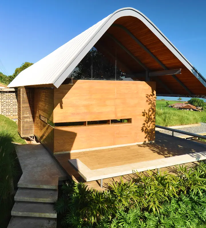 D’Ros was designed by Indonesian architect Budi Pradono using his Omah Tanah concept, where compacted soil forms the main structure of the building.