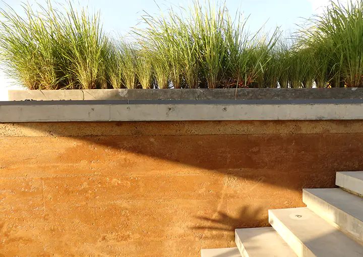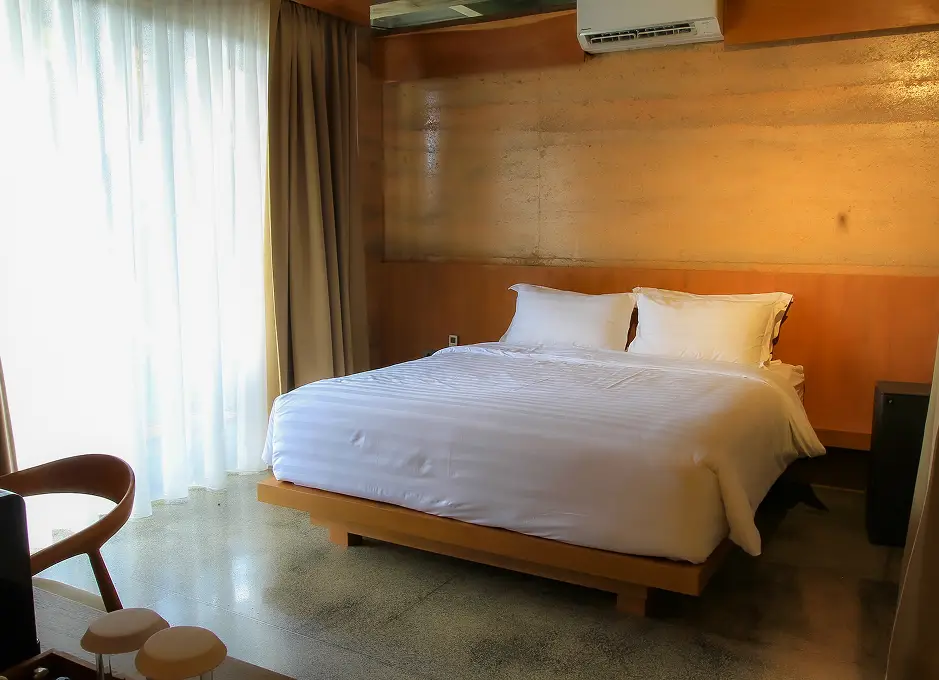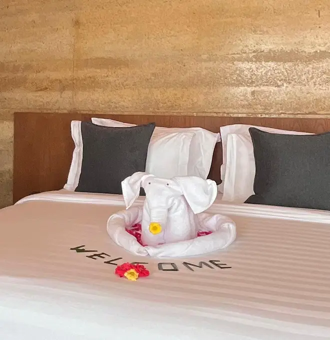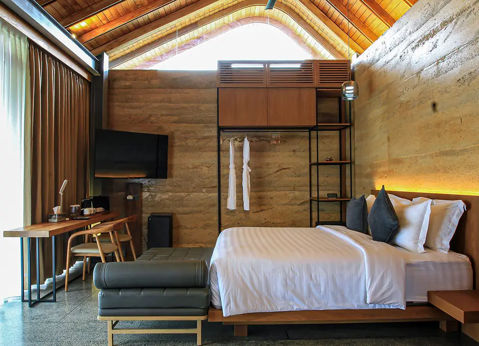 Each room is designed to feel calm and functional, with teak furniture that complements the rammed-earth walls and creates a warm, grounded atmosphere. Every space opens to nature and invites you to rest at your own pace.