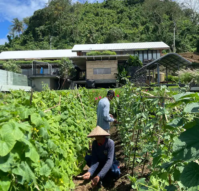 Founded by Douglas and Rossa, a couple who fell in love with the quiet beauty of Pantai Lodji. They imagined a place where guests could experience the area’s unique landscape — rice fields flowing toward the sea, wide ocean views, and gentle hills framing the horizon.